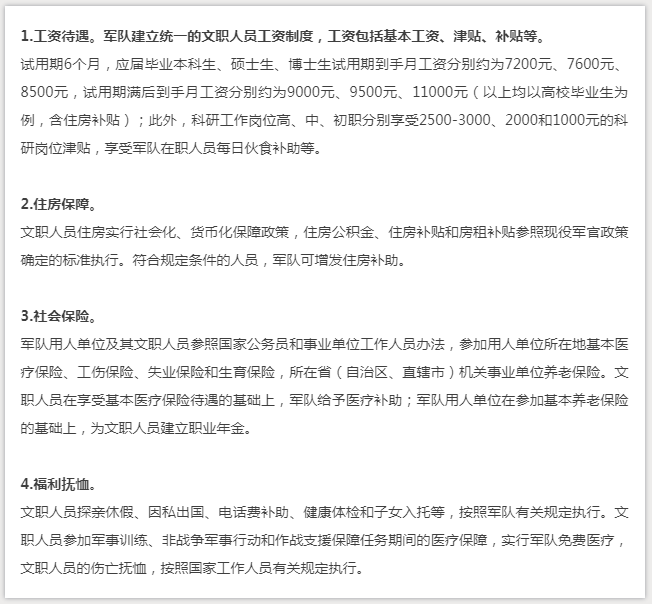 而且福利待遇趕超公務(wù)員和事業(yè)單位,在11月份,中國人民解放軍軍事科學(xué)院軍事科學(xué)信息研究中心2020軍隊(duì)文職人員招錄宣講會上就有詳細(xì)介紹。如下圖: